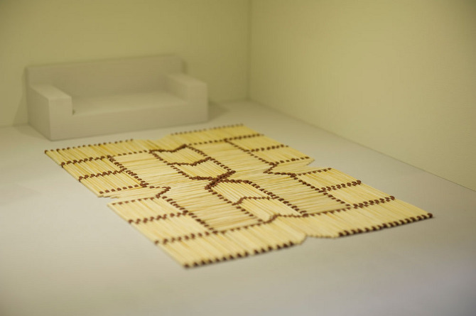 Als je de tapijten op een afstand bekijkt, dan lijken het gewone decoratieve tapijten. Kom je dichterbij verrast het je enorm door het gebruik van producten die normaal geen waarde hebben als ze eenmaal zijn gebruikt, zoals plastic vorken, pleisters, vloertegels, pasta, watjes en knijpers.