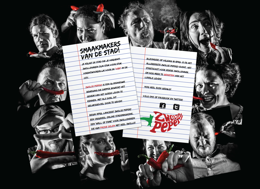 Je krijgt de stad die je verdient! Zwollenaren zijn stuk voor stuk verantwoordelijk voor de ‘vibe’ in de city.  Zwolse Peperz is een gloednieuwe beweging die dapper beweert het geheim van het goede leven te kennen. Met als doel dit geluksgevoel door te geven!Begin april 2014 lanceert Zwolse Peperz een origineel online stadsmagazine. Een ‘wall of fame’ voor Zwollenaren die hun passie delen met heel Zwolle!