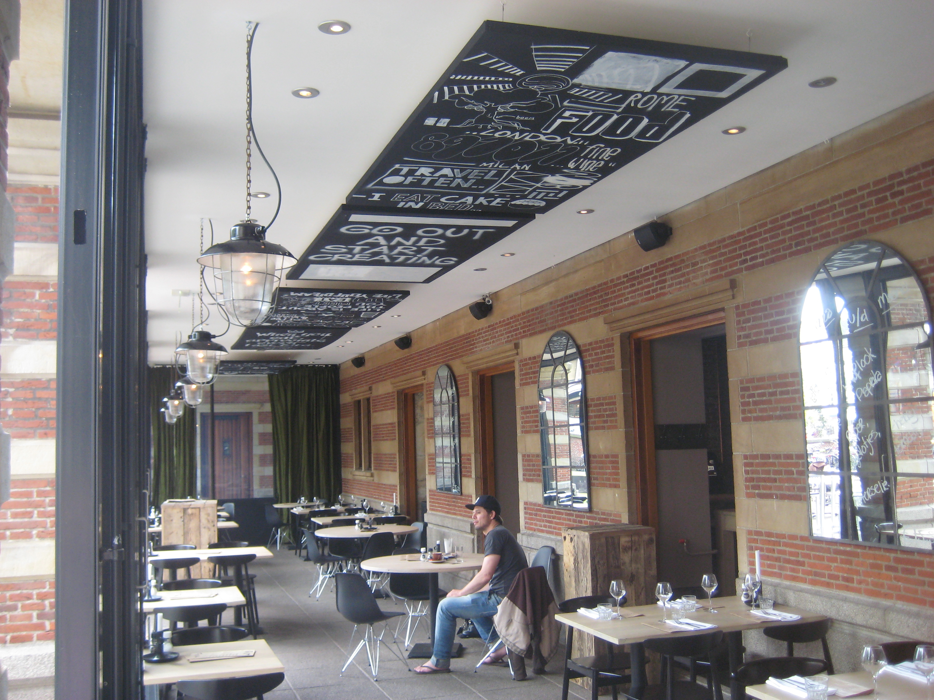 Ik ben het dan ook niet eens dat je dat met weinig middelen er even wat opklatst als ‘decoratie’. Als je een kunstenaar serieus in je zaak aan het werk zet, hij denkt mee in het concept en maakt een vertaling van je concept. Dit heeft meerwaarde voor het eindresultaat en de totaalbeleving van de eindconsument. Een heel goed voorbeeld vind je in Leiden bij Italian bar bistro City Hall waar de huisstijl naar aanleiding van de kunst is uitgewerkt in communicatie door een van de characters tot leven te brengen.