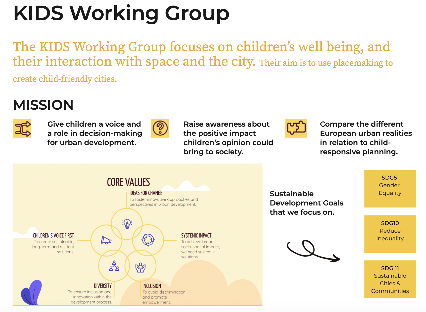 Onze werkgroep richt zich op het welzijn van kinderen en hun interactie met de ruimte en de stad/dorp/buitengebied en plek. Het doel is om met Placemaking kindvriendelijke steden te creëren.